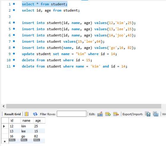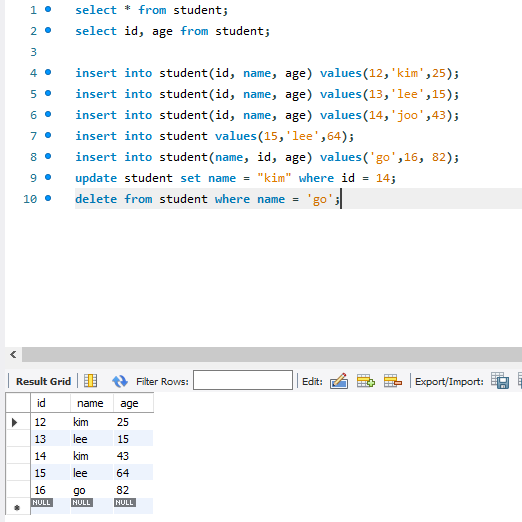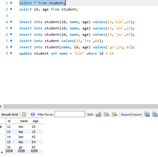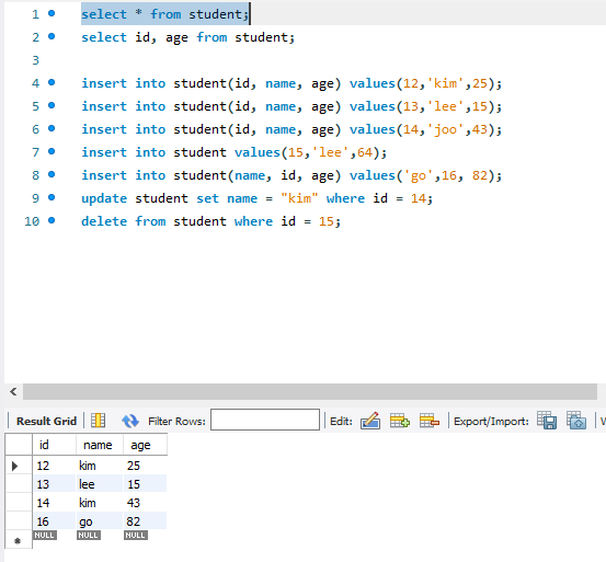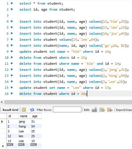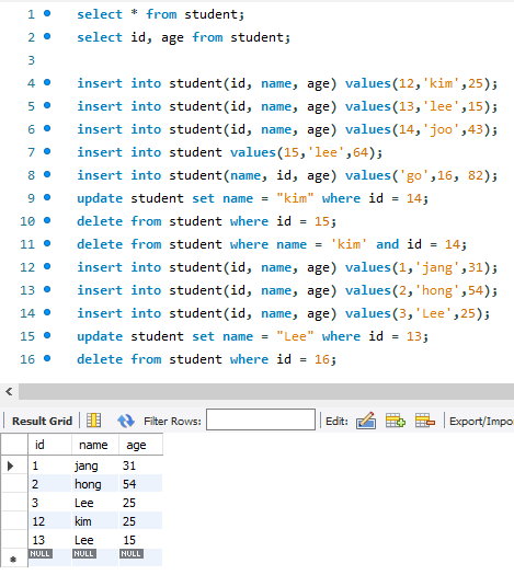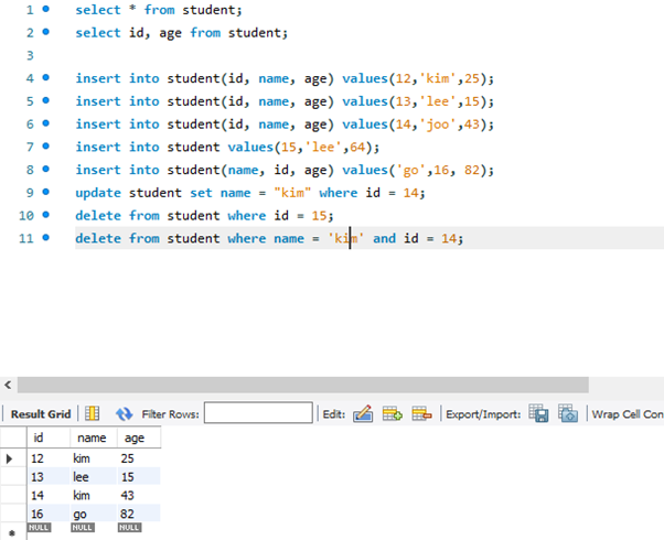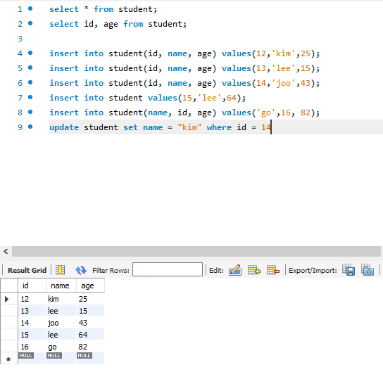 Where 로 조건을 줌,,, 아이디가 12인 애 이름만 kim으로 바꿔줘... 하면 12아이디만 바뀜