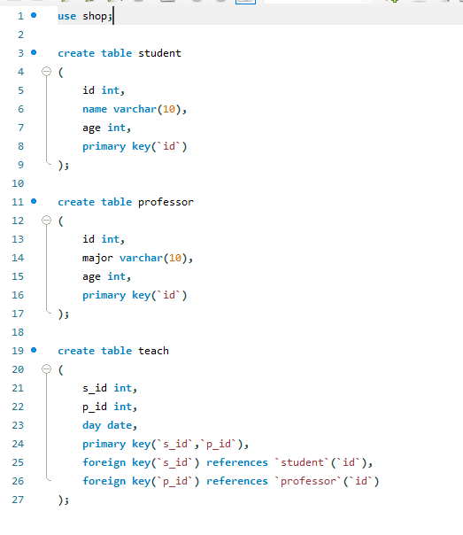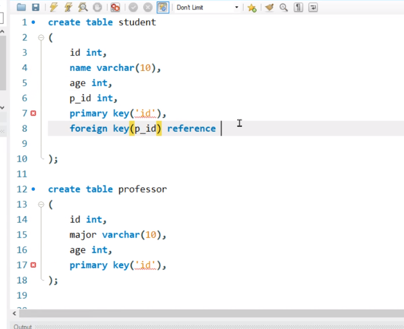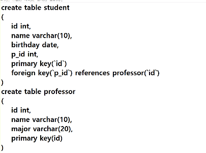 create table professor 먼저 실행한 뒤 create table student 를 실행하면 실행 순서에 따라 professor 테이블을 먼저 읽었으므로 문제없이 foreign key(`p_id`) reference `professor`(`id`)가 실행될 수 잇음.