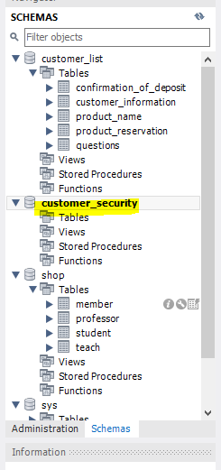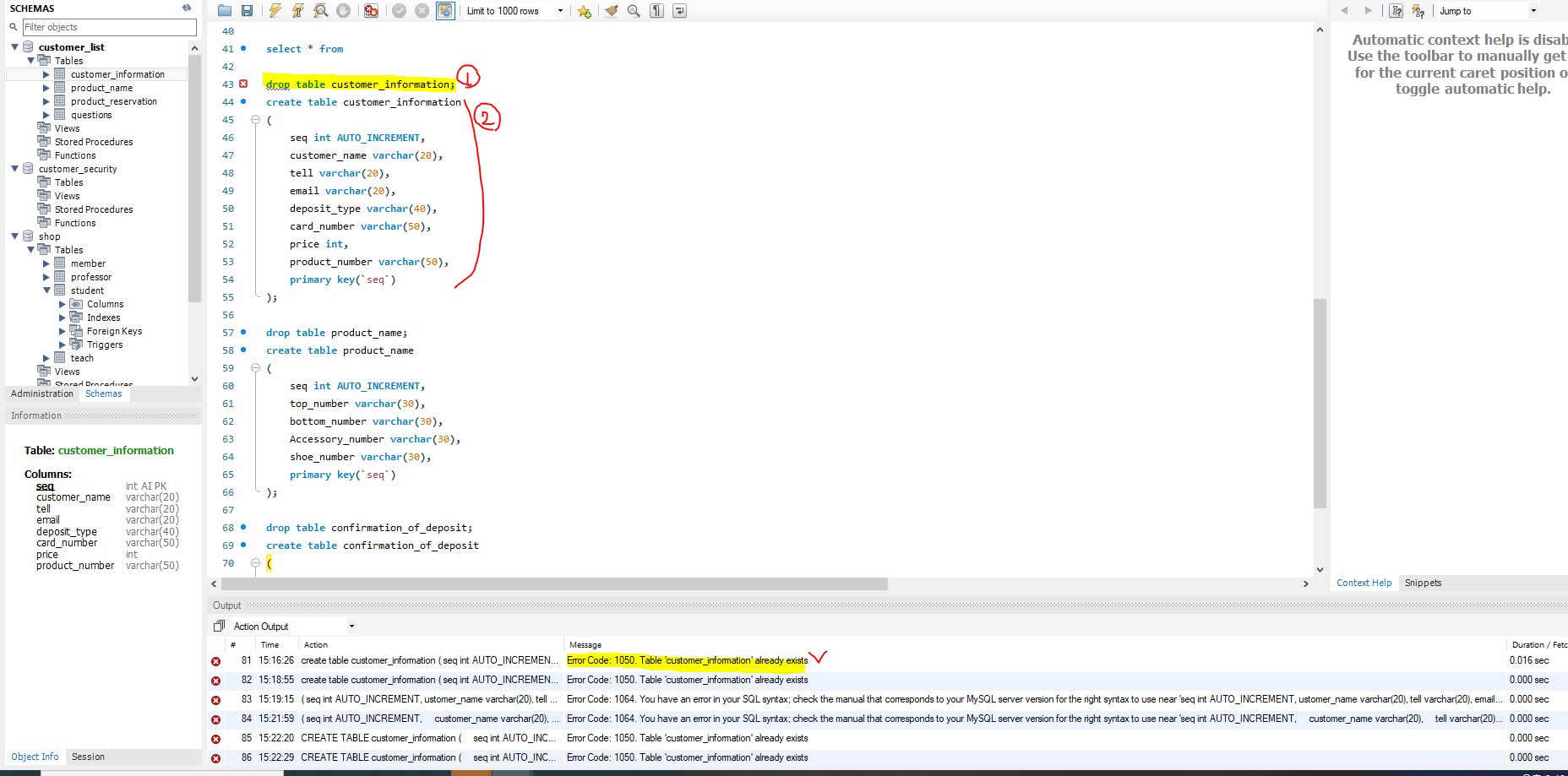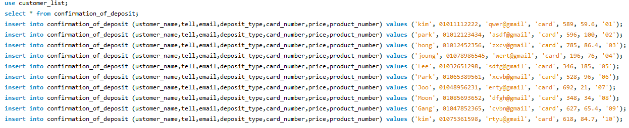 select * from student; select id, age from student; insert into student(id, name, age) values(12,'kim',25); insert into student(id, name, age) values(13,'lee',15); insert into student(id, name, age) values(14,'joo',43); insert into student values(15,'lee',64); insert into student(name, id, age) values('go',16, 82); update student set name = "kim" where id = 14; delete from student where id = 15; delete from student where name = 'kim' and id = 14; insert into student(id, name, age) values(1,'jang',31); insert into student(id, name, age) values(2,'hong',54); insert into student(id, name, age) values(3,'Lee',25); update student set name = "Lee" where id = 13; delete from student where id = 16; use customer_list; select * from confirmation_of_deposit; insert into confirmation_of_deposit (ustomer_name,tell,email,deposit_type,card_number,price,product_number) values ('kim', 01011112222, 'qwer@gmail', 'card', 589, 59.6, '01'); insert into confirmation_of_deposit (ustomer_name,tell,email,deposit_type,card_number,price,product_number) values ('park', 01012123434, 'asdf@gmail', 'card', 596, 100, '02'); insert into confirmation_of_deposit (ustomer_name,tell,email,deposit_type,card_number,price,product_number) values ('hong', 01012452356, 'zxcv@gmail', 'card', 785, 86.4, '03'); insert into confirmation_of_deposit (ustomer_name,tell,email,deposit_type,card_number,price,product_number) values ('joung', 01078986545, 'wert@gmail', 'card', 196, 76, '04'); insert into confirmation_of_deposit (ustomer_name,tell,email,deposit_type,card_number,price,product_number) values ('Lee', 01032651298, 'sdfg@gmail', 'card', 346, 185, '05'); insert into confirmation_of_deposit (ustomer_name,tell,email,deposit_type,card_number,price,product_number) values ('Park', 01065389561, 'xcvb@gmail', 'card', 528, 96, '06'); insert into confirmation_of_deposit (ustomer_name,tell,email,deposit_type,card_number,price,product_number) values ('Joo', 01048956231, 'erty@gmail', 'card', 692, 21, '07'); insert into confirmation_of_deposit (ustomer_name,tell,email,deposit_type,card_number,price,product_number) values ('Moon', 01085693652, 'dfgh@gmail', 'card', 348, 34, '08'); insert into confirmation_of_deposit (ustomer_name,tell,email,deposit_type,card_number,price,product_number) values ('Gang', 01047852365, 'cvbn@gmail', 'card', 627, 65.4, '09'); insert into confirmation_of_deposit (ustomer_name,tell,email,deposit_type,card_number,price,product_number) values ('kim', 01075361598, 'rtyu@gmail', 'card', 618, 84.7, '10'); select * from questions; insert into questions (ustomer_name,tell,Inquiry_code,email,date_of_inquiry) values ('kim',01011112222,01,'qwer@gmail','2023-05-12'); insert into questions (ustomer_name,tell,Inquiry_code,email,date_of_inquiry) values ('park',01012123434,02,'asdf@gmail','2023-01-27'); insert into questions (ustomer_name,tell,Inquiry_code,email,date_of_inquiry) values ('hong', 01012452356,03,'zxcv@gmail','2022-08-13'); select * from product_reservation; insert into product_reservation (ustomer_name,Product_number,confirmation_of_deposit,Address,tell)values('kim',01,,'Asdfa','01011112222'); insert into product_reservation (ustomer_name,Product_number,confirmation_of_deposit,Address,tell)values(,,,,); insert into product_reservation (ustomer_name,Product_number,confirmation_of_deposit,Address,tell)values(,,,,); select * from drop table customer_information; create table customer_information ( seq int AUTO_INCREMENT, customer_name varchar(20), tell varchar(20), email varchar(20), deposit_type varchar(40), card_number varchar(50), price int, product_number varchar(50), primary key(`seq`) ); drop table product_name; create table product_name ( seq int AUTO_INCREMENT, top_number varchar(30), bottom_number varchar(30), Accessory_number varchar(30), shoe_number varchar(30), primary key(`seq`) ); drop table confirmation_of_deposit; create table confirmation_of_deposit ( customer int, product_name int, primary key(`customer`,`product_name`), foreign key(`customer`) references `customer_information`(`seq`), foreign key(`product_name`) references `customer_information`(`seq`) );장렬하게 망한 흔적.