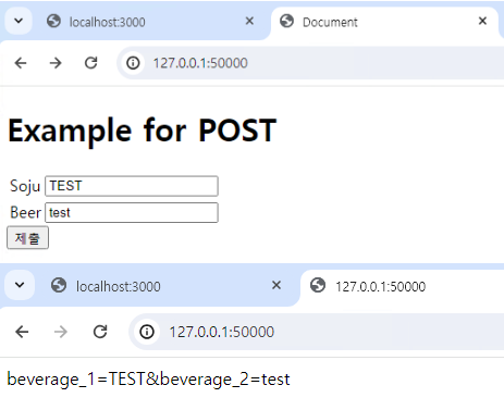 한마디로 get하고 post 동작이 다르다는 걸 보는 예제라고 보시면 돼요.<!DOCTYPE html> <html lang="en"> <head> <meta charset="UTF-8"> <meta name="viewport" content="width=device-width, initial-scale=1.0"> <title>Document</title> </head> <body> <h1>Example for POST</h1> <form method = "post"> <table> <tr> <td> Soju</td> <td><input type="text" name = "beverage_1"></td> </tr> <td>Beer</td> <td><input type="text" name = "beverage_2"></td> </table> <input type="submit"> </form> </body> </html>const http = require('http'); const fs = require('fs'); http.createServer((request, response) => { if(request.method === 'GET'){ fs.readFile('./231129_09.html', (error, data) => { response.writeHead(200,{'content-type':'text/html'}); response.end(data); console.log(`${request.method} 방식의 요청입니다.`); }); }else if(request.method === 'POST'){ request.on('data', (data) => { response.writeHead(200,{'content-type':'text/html'}); response.end(data); console.log(`${request.method} 방식의 요청입니다.`); }); } }).listen(50000,() => { console.log('서버가 동작 중입니다, http://127.0.0.1:50000'); });터미널 결과는 아래와 같다.