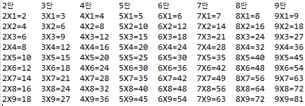 package Assignment; public class Training_231012_2 { public static void main(String[] args) { // TODO Auto-generated method stub for(int k = 2; k < 10; k++) { System.out.print(""+ k + "단" + "\t"); //제일 윗 단에 2단부터 9단까지 표기 } System.out.println(); for(int j = 1; j<10; j++) { //1번부터 9번까지 반복하면서 1씩 더함 ...각 단의 1~9 //System.out.print(i + "단" + '\t'); //기존에 작성했던 것 for(int i = 2; i < 10; i++) { //2단부터 9단까지 반복, 1씩 더함... int num = i * j; // System.out.print(i + "X" + j + "=" + num + '\t' ); //위의 두 줄을 한 줄로 줄인다면 아래와 같다. //System.out.print(i + "X" + j + "=" + (i * j) + '\t' ); } System.out.println(); } } }결과물은 아래와 같다.