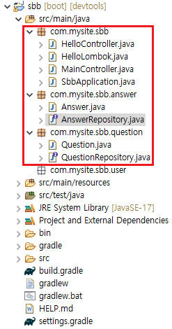 본격적으로 SBB를 만들기 전에 앞서 패키지 정리를 했다. 지금까지 우리가 작성한 파일은 다음처럼 com.mysite.sbb 패키지 안에 모두 모여 있었으나, 하나의 패키지 안에 모든 자바파일을 넣고 관리하는 것은 바람직하지 않다. SBB는 도메인별로 패키지를 나누어 자바파일을 관리하기 위해 도메인을 분류했다.