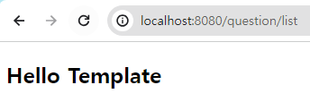 <!DOCTYPE html> <html> <head> <meta charset="UTF-8"> <title>Insert title here</title> </head> <body> <h2>Hello Template</h2> </body> </html>package com.mysite.sbb.question; import org.springframework.stereotype.Controller; import org.springframework.web.bind.annotation.GetMapping; @Controller public class QuestionController { @GetMapping("/question/list") public String list() { return "question_list"; } }