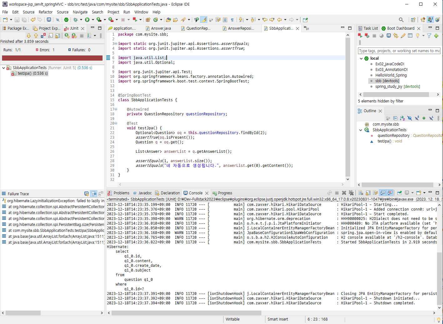 package com.mysite.sbb; import static org.junit.jupiter.api.Assertions.assertEquals; import static org.junit.jupiter.api.Assertions.assertTrue; import java.util.List; import java.util.Optional; import org.junit.jupiter.api.Test; import org.springframework.beans.factory.annotation.Autowired; import org.springframework.boot.test.context.SpringBootTest; @SpringBootTest class SbbApplicationTests { @Autowired private QuestionRepository questionRepository; @Test void testJpa() { // QuestionRepository를 통해 Id 값이 2인 Question을 조회함 Optional<Question> oq = this.questionRepository.findById(2); // 조회된 Question이 존재하는지 확인 assertTrue(oq.isPresent()); // 조회된 Question 객체를 얻어옴 Question q = oq.get(); // Question에 연관된 Answer 목록을 가져옴 List<Answer> answerList = q.getAnswerList(); // Answer 목록의 크기가 1이어야 함 assertEquals(1, answerList.size()); // Answer 목록에서 첫 번째 Answer의 내용이 "네 자동으로 생성됩니다."와 같아야 한다. assertEquals("네 자동으로 생성됩니다.", answerList.get(0).getContent()); } }id가 2인 질문에 답변을 한 개 등록했으므로 위와 같이 검증할 수 있지만, 위 코드를 실행하면 에러가 뜬다.