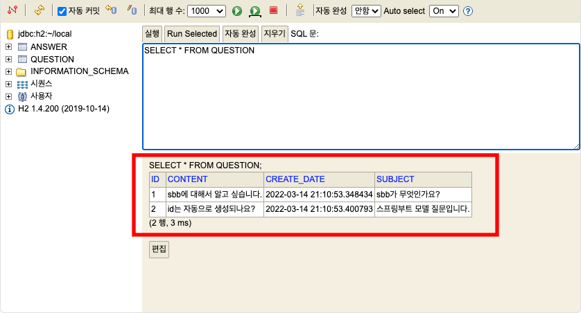 실제 데이터베이스에 값이 잘 들어갔는지 확인해 보기 위해 다시 로컬서버를 시작하고 H2 콘솔에 접속하여 SELECT * FROM QUESTION 을 실행하면, 저장한 저장한 Question 객체의 값이 데이터베이스에 저장된 것을 확인한 수 있다.