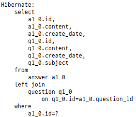 답변에 연결된 질문 찾기는 Answer 엔티티에 question 속성이 정의되어 있어서 위에서 찾은 것 처럼 찾을 수있다. 반대로 질문에서 답변을 찾으려면 질문 엔티티에 정의한 answerList를 사용하면 된다.