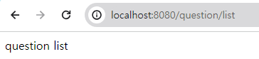 package com.mysite.sbb.question; import org.springframework.stereotype.Controller; import org.springframework.web.bind.annotation.GetMapping; import org.springframework.web.bind.annotation.ResponseBody; @Controller public class QuestionController { @GetMapping("/question/list") @ResponseBody public String list() { return "question list"; } }수정하고 다시 http://localhost:8080/question/list에 접속하면 화면에 "question list" 문자열이 출력된다.
