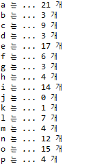 package Assignment; public class Training_1012_5 { public static void main(String[] args) { String little = "Once when I was six years old I saw a magnificent picture in a book," + "called True Stories from Nature, about the primeval forest." + "nIt was a picture of a boa constrictor in the act of swallowing an animal. Here is a copy of the drawing. "; int[] counts = new int[26]; for (int i = 0; i < little.length(); i++) { char alphabet = little.charAt(i); if ((alphabet >= 'a' && alphabet <= 'z') || (alphabet >= 'A' && alphabet <= 'Z')) { counts[alphabet - 'a']++; } } for (int i = 0; i < 26; i++) { char letter = (char) ('a' + i); System.out.println(letter + " 는 ... " + counts[i] + " 개"); } } }
