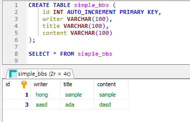 -- 데이터베이스 생성 CREATE DATABASE gurodb; CREATE TABLE myuser ( id VARCHAR(10), name VARCHAR(10) CHARACTER SET utf8mb4 ); -- 테이블 생성 CREATE TABLE simple_bbs ( id INT AUTO_INCREMENT PRIMARY KEY, writer VARCHAR(100), title VARCHAR(100), content VARCHAR(100) ); -- 한글로 입력하고 싶다면 아래처럼 테이블을 만든다. CREATE TABLE simple_bbs( id INT(4) not null AUTO_INCREMENT PRIMARY KEY, writer VARCHAR(100) CHARACTER SET utf8mb4, title VARCHAR(100) CHARACTER SET utf8mb4, content VARCHAR(100) CHARACTER SET utf8mb4 );DTO 클래스 정의 (SimpleBbsDto.java)