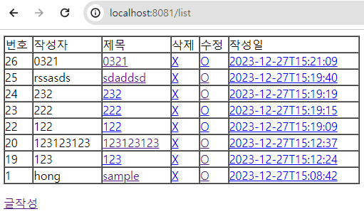 package com.study.springboot.dto; import lombok.Data; import java.time.LocalDateTime; //LocalDateTime 을 사용하기 위해 import 함. @Data public class SimpleBbsDto { private int id; private String writer; private String title; private String content; private LocalDateTime createDate; }list.jsp